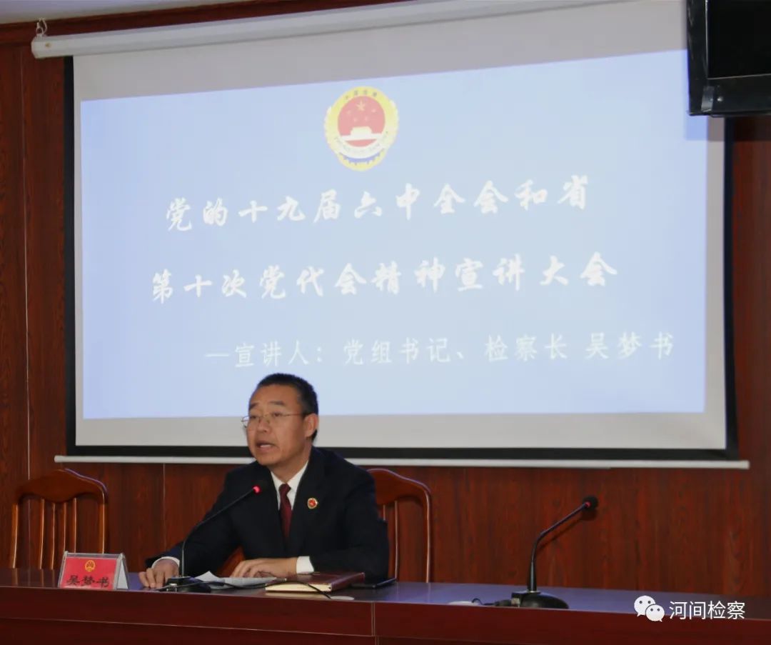 12月23日下午,河间市检察院党组书记、检察长吴梦书就贯彻落实党的十九届六中全会和省第十次党代会精神给全体干警作了专题宣讲。