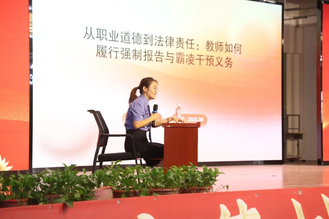 为进一步筑牢校园安全防线,强化教师队伍法治意识与师德修养,近日,河间市检察院未检检察官应邀走进河间市英华学校开展了“师风师德建设”专题普法宣传活动,为即将迎来新学期的350余名教师送上一堂有温度又有力度的法治课。