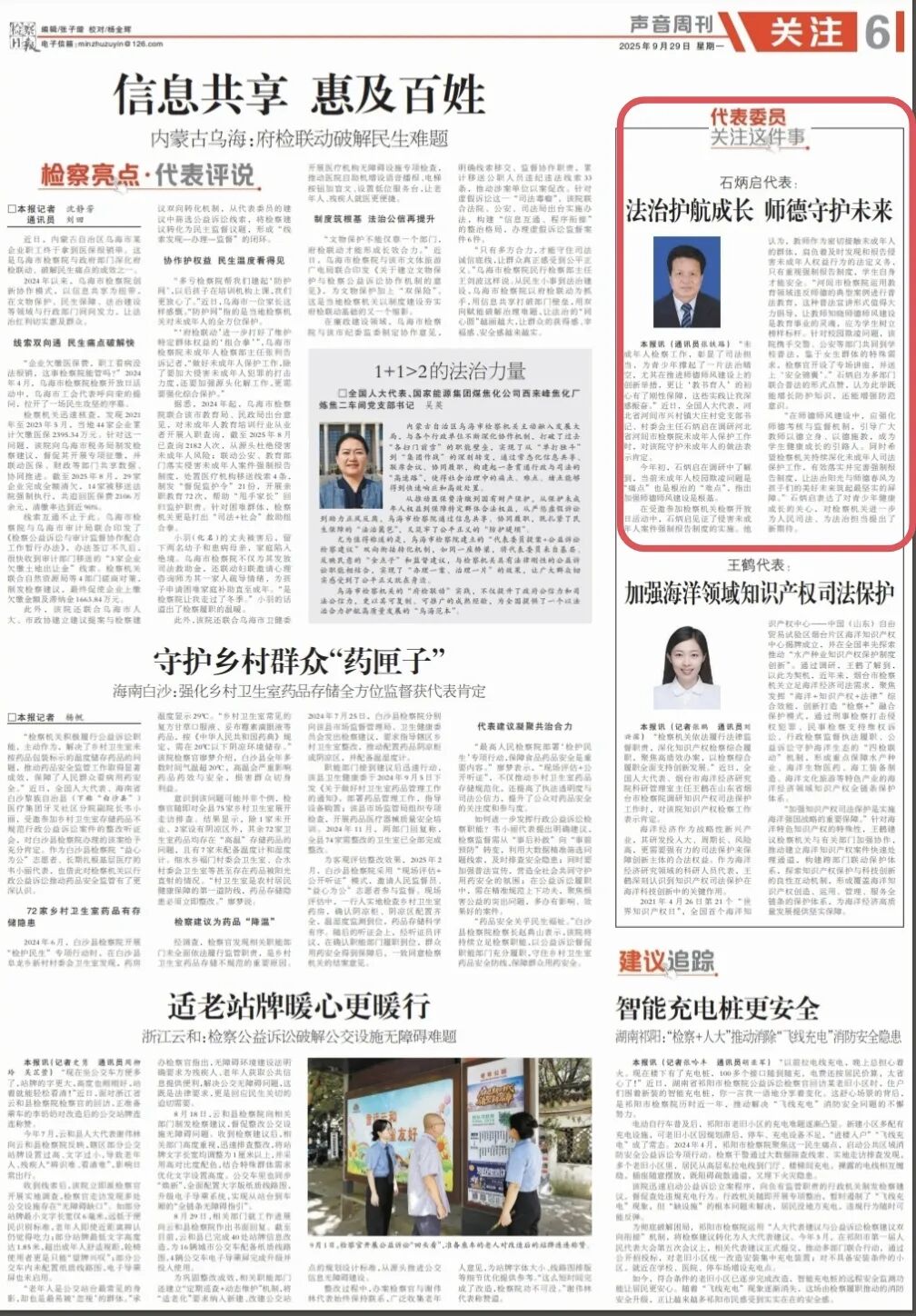 “在师德师风建设中,应强化师德考核与监督机制,引导广大教师以德立身、以德施教,成为学生健康成长的引路人。同时希望检察机关持续深化未成年人司法保护工作,有效落实并完善强制报告制度,让法治阳光与师德春风为孩子们的美好未来筑起最坚实的屏障。”石炳启表达了对青少年健康成长的关心,对检察机关进一步为人民司法、为法治担当提出了新期待。