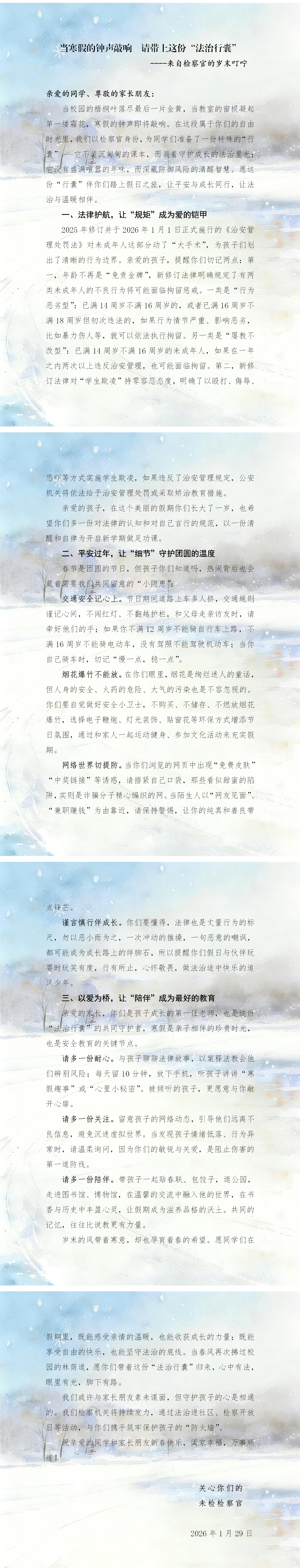 冬意渐浓,寒假的脚步悄然临近,同学们即将迎来一段充满欢乐与求索的美好时光。但安全防线不容松懈,法治意识更需常伴左右。为了给全市中小学生的寒假生活筑牢“安全屏障”,河间市人民检察院精心筹备了两份特别的“法治礼物”——一段干货满满的安全防护视频,一封饱含期许的致全市中小学生及家长的信,愿与同学、家长们一同守护假期平安,点亮青春底色。:3